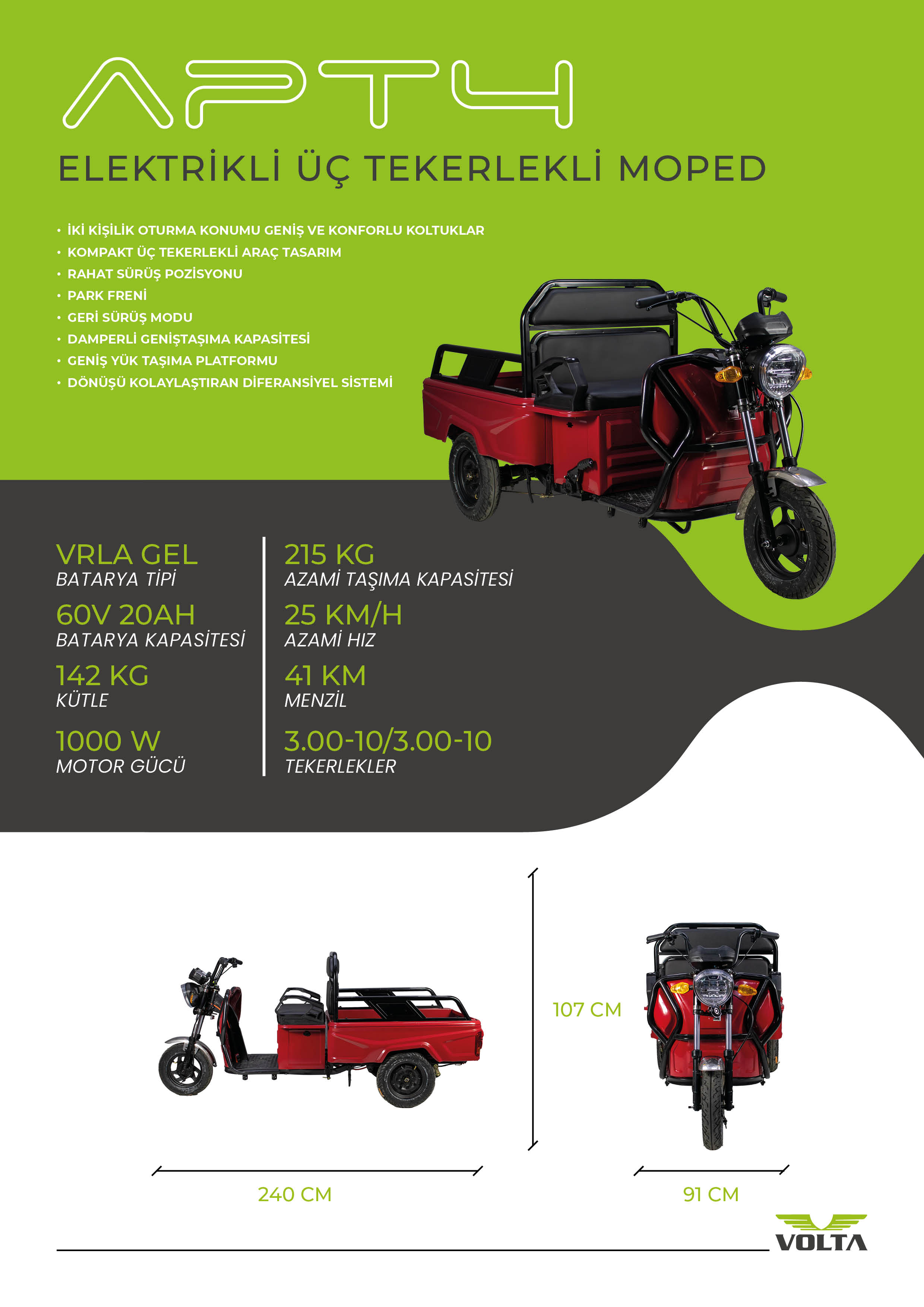 APT4 ile isteklerinize öncelik verin. Üç tekerlekli kompakt tasarımı ve mükemmel dönüş kabiliyeti ile konforlu bir sürüş deneyimi sunuyor. 215 Kg taşıma kapasitesi ile yüklerinizi kolayca taşıyın.