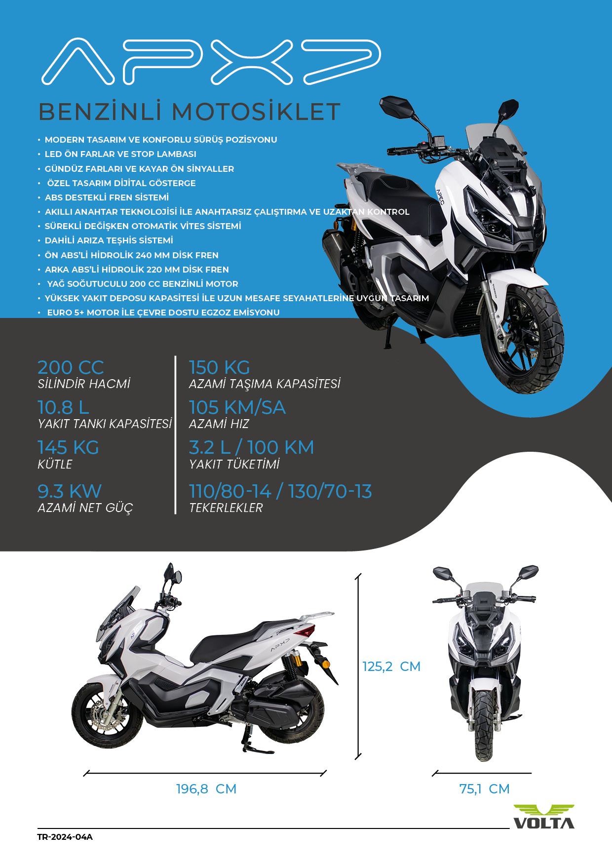 APEC APX7, modern sürüş deneyimini sanata dönüştüren bir mühendislik harikası. 105 km/s'lik azami hızıyla adrenalin tutkunlarına hızın doruklarında eşsiz bir heyecan sunarken, 145 kg'lık hafif ve zarif yapısıyla yolda adeta süzülüyor. 10,8 litrelik yakıt tankı kapasitesi, durmaksızın özgürlüğe doğru yol almanızı sağlıyor.